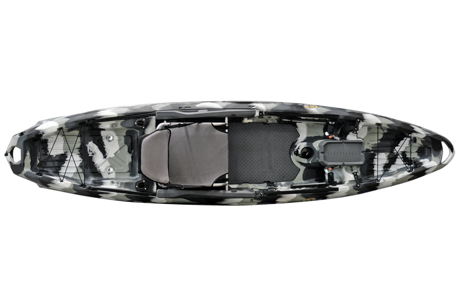 The cathedral tri-hull features two outer pontoons along with a central pontoon with deep channels in between. The Big Fish seat offers all day paddling comfort with multiple sitting and standing configurations – high, low, recline and flip away, which doubles as a lean bar when standing. The deck features a sturdy reinforced standing platform, storage space along the gunwales and built in rod holders with rod tip protectors and open bow and stern storage areas for easy gear access. Another key feature is the removable Sonar Pod, designed to help you install electronics such as fish finders with ease.